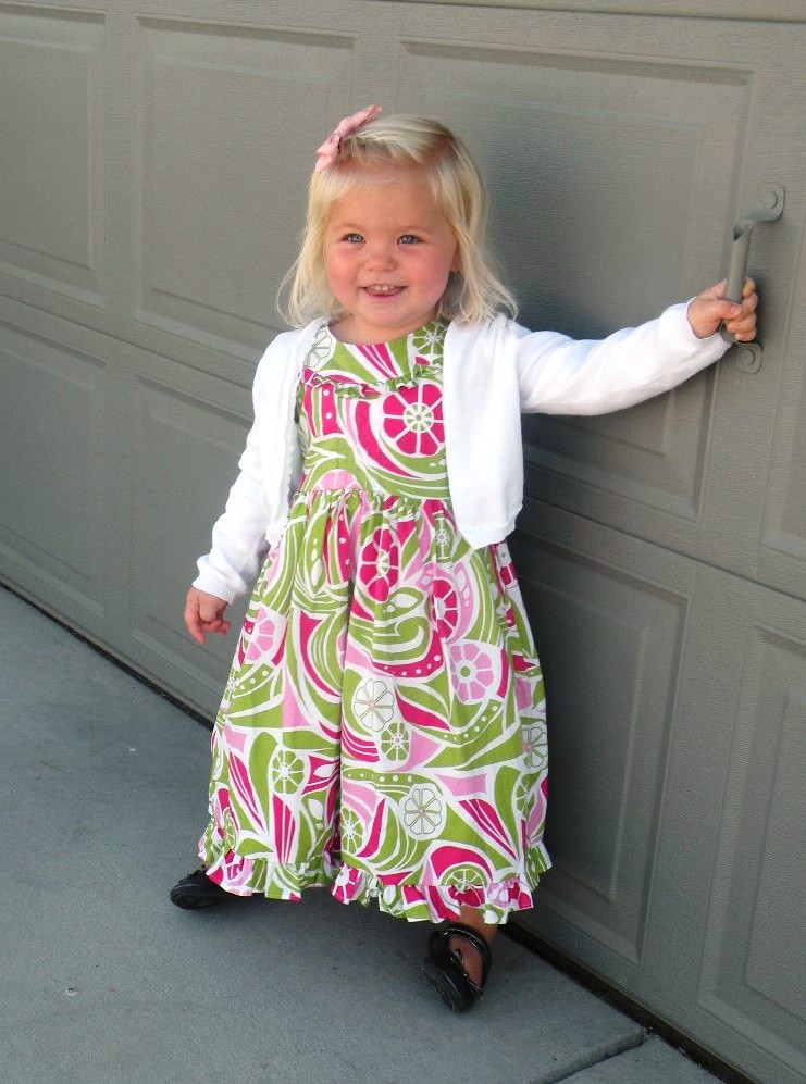 My mom got this dress for Darcy for her birthday and I have been waiting to have her wear it for Ezra's blessing day. She usually wears shorter dresses and she seemed a little surprised by the length when I first put in on her. We went outside for a little photo shoot before church and I had Ashley act crazy behind me to get some real smiles from Darcy.